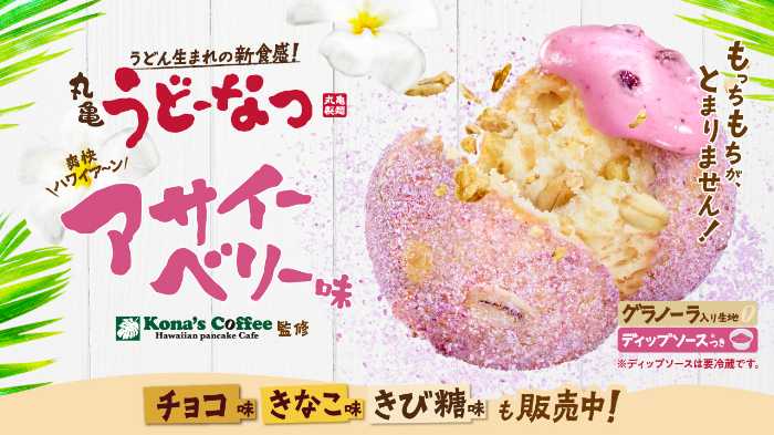 2025年7月17日から登場する『丸亀うどーなつ アサイーベリー味』は、人気ハワイアンカフェ「コナズ珈琲」が監修した夏限定フレーバー。