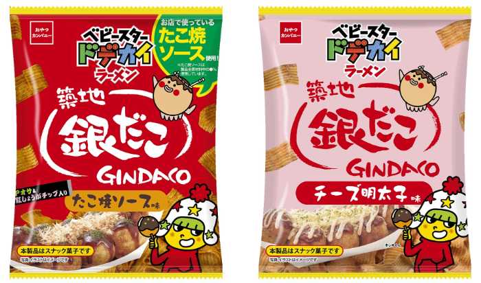 おやつカンパニーと築地銀だこの人気コラボ企画から、通算12回目となる新作が登場!今回は、ベビースタードデカイラーメンで「たこ焼ソース味」と「チーズ明太子味」の2つのフレーバーを展開。
