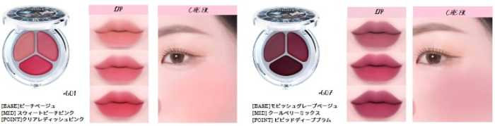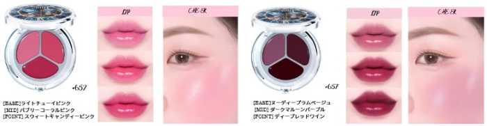 ツヤ感の「グローイングタイプ」は、ふんわり色づく柔らかさと上品な色気を両立させます。どちらもベース・ミドル・ポイントの3色で構成され、グラデーションや単色使いでメイクの幅が広がります。