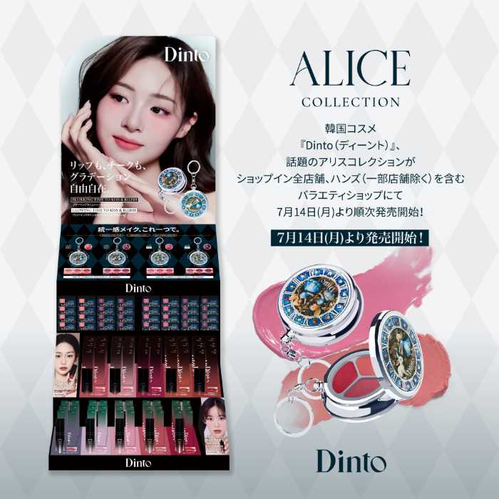韓国発コスメブランド「Dinto(ディーント)」から、童話『不思議の国のアリス』をモチーフにした「アリスコレクション」が2025年7月14日(月)より順次登場。懐中時計型の限定パッケージに収められたリップ&チークは、見た目の可愛さだけでなく、マットとグロウの2種テクスチャで仕上がりも自在♡カラーの組み合わせ次第で自分だけのメイクが楽しめる、ロマンティックな新作に注目です。