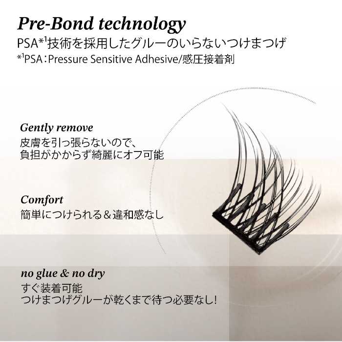 Ollio最大の特長は、グルー不要で貼れる「PSA(感圧接着剤)」技術。ツイーザーで下から装着し、軽く押すだけでピタッと密着。まつげとしっかり馴染み、根元から立ち上がる美しいカールが長時間持続します。