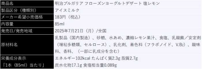 今回新登場の「明治ブルガリア フローズンヨーグルトデザート 塩レモン」は、明治独自のアイス専用ヨーグルトをベースに、LB81乳酸菌で発酵させたすっきりとした味わいが魅力。
