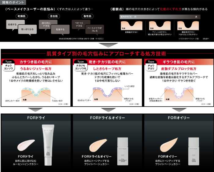 各タイプには毛穴カバーに優れたテクスチャーを採用。