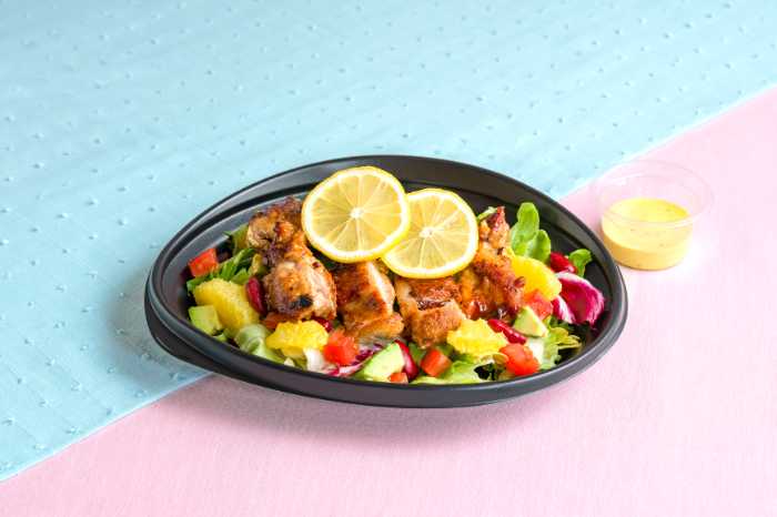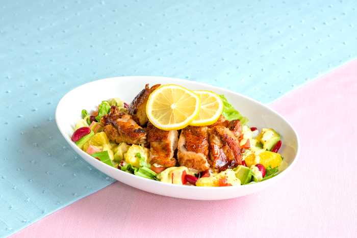 食事メニューで注目したいのは、さっぱり塩レモンでマリネしたグリルドチキンを主役にしたサラダ。オレンジや豆などの彩り豊かな野菜と一緒に、ハニーマスタードドレッシングで仕上げたヘルシーな一皿です。