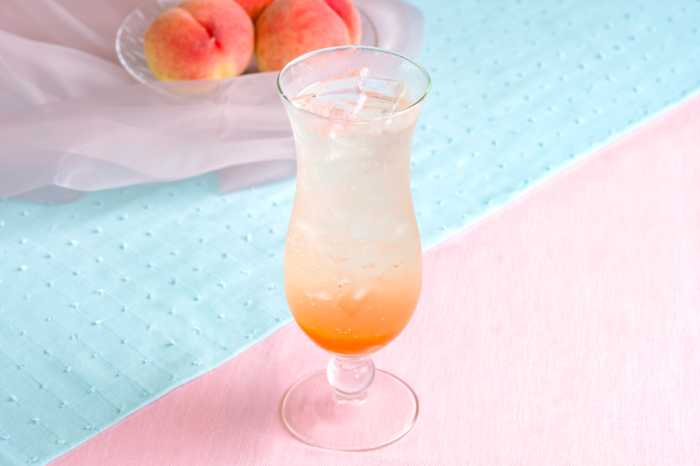 ドリンクメニューも夏らしさ満点♡「ピーチスカッシュ」(イートイン825円/テイクアウト810円)は、ほんのり甘い桃の香りが魅力。
