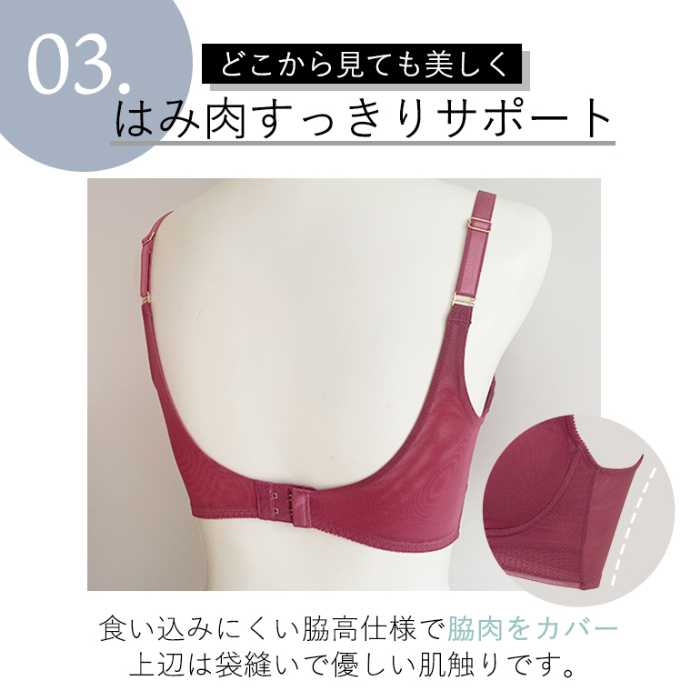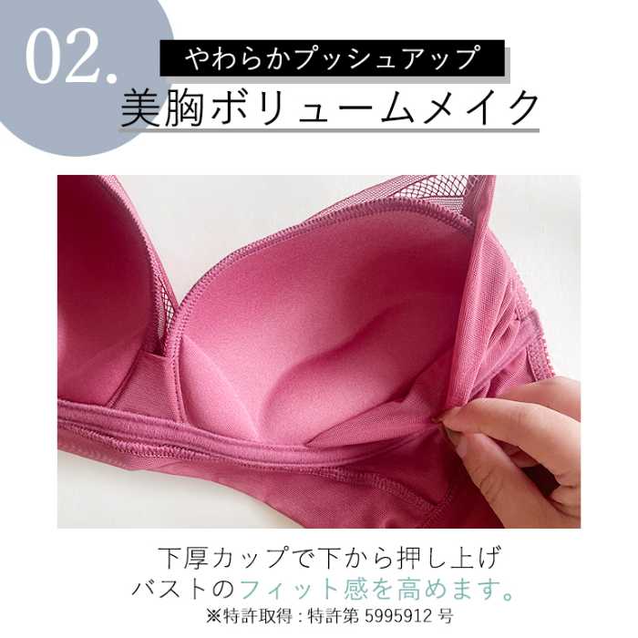 三方向からカップをしっかりグリップして持ち上げる設計で、ノンワイヤーとは思えない立体的な丸胸を形成します。
