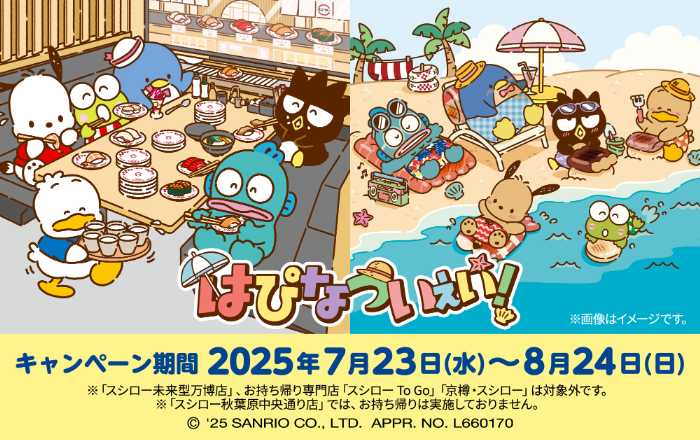 キュートなサンリオキャラクター『はぴだんぶい』と、回転寿司チェーン「スシロー」の夢のコラボが、2025年7月23日(水)よりスタート♡かわいいおすしメニューやスイーツ、コラボグッズ付きのドリンクやテイクアウトなど、見逃せないコンテンツが盛りだくさん!前半と後半で内容が変わるので、何度行っても楽しい♪夏の思い出づくりに、ぜひチェックしてみて。