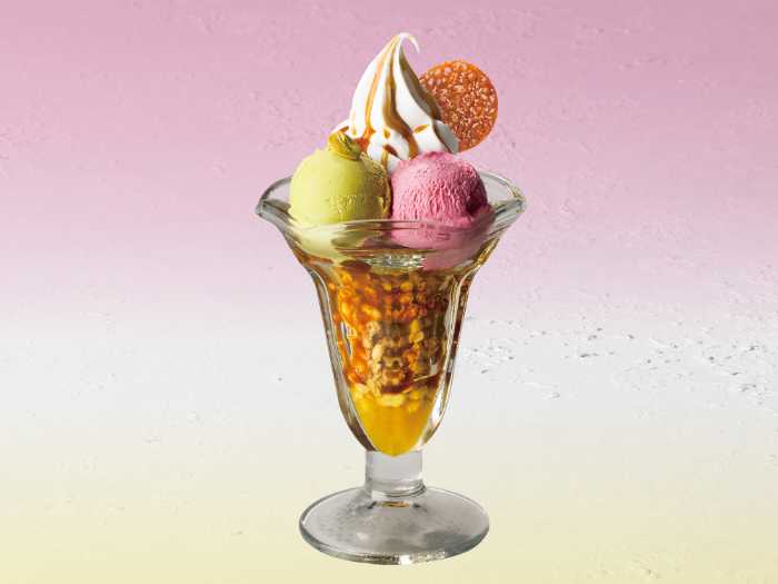 「パフェ佐藤」全面監修の「ピスタチオとカシスの塩キャラメルパフェ」は、異なる食感と味わいの重なりが魅力。