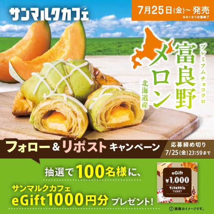 今回の発売を記念し、サンマルクカフェ公式Xで「プレミアムチョコクロ 富良野メロン」フォロー&リポストキャンペーンを開催中。