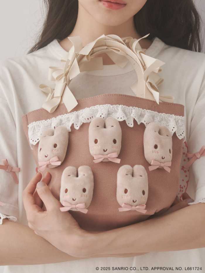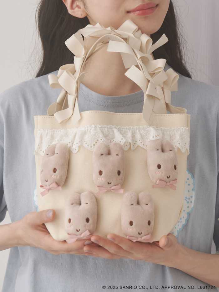「マロンクリームribbonハンドルミニトート」は、merry jennyらしいころんとしたフォルムに、マロンクリームのお顔が“むぎゅむぎゅ”っと並んだぬいぐるみ仕様が印象的。