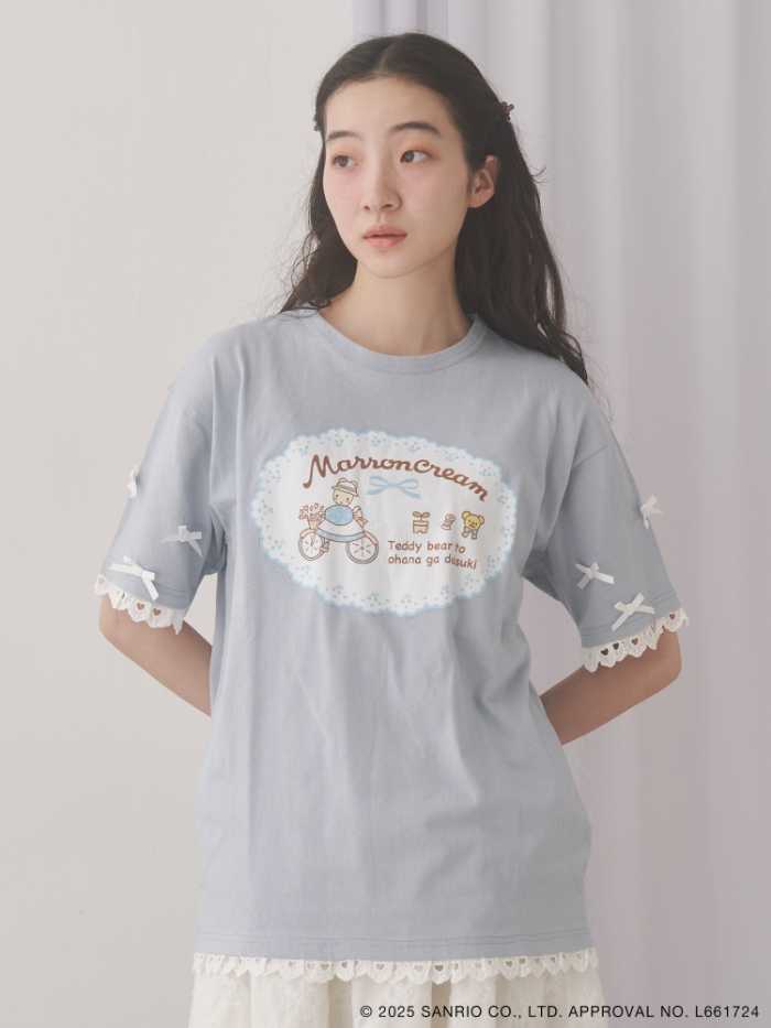 夏にぴったりな「マロンクリームribbonスリーブTee」は、シンプルなTシャツにレースの裾やお袖のリボンでアクセントを加えた1枚。