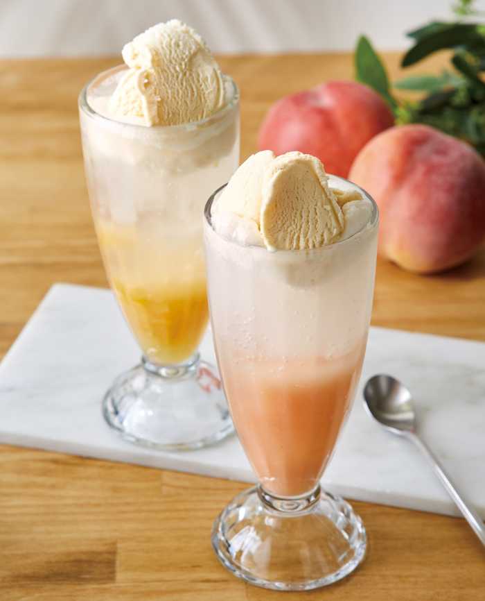 桃のピューレとミルクバニラアイスを合わせた「ピーチ&ミルクバニラ」と、レモンの自家製コンフィチュールが効いた「レモネード&ミルクバニラ」(各イートイン968円/テイクアウト680円)は、夏にぴったりのご褒美ドリンクです♡