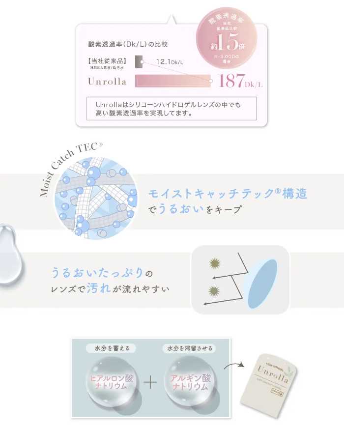 カラコンブランド「アンローラ」は、日常使いにぴったりなナチュラルな水光デザインと高機能レンズを兼ね備えた新作。プリズムバラスト技術を採用し、ハイライトが回りにくいのが特徴です。