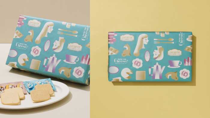 明るい水色の包装紙には、忠犬ハチ公やティーカップなどのモチーフが描かれ、ポップで可愛らしい雰囲気に仕上げられています。