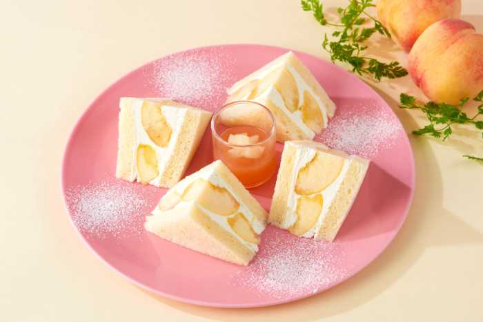 ホテルニューオータニ幕張「ベイコートカフェ」で味わう、まるごと桃のフルーツサンドウィッチ。見た目の華やかさ、口いっぱいに広がる果汁感、ホテルメイドならではの上品な美味しさになっています。