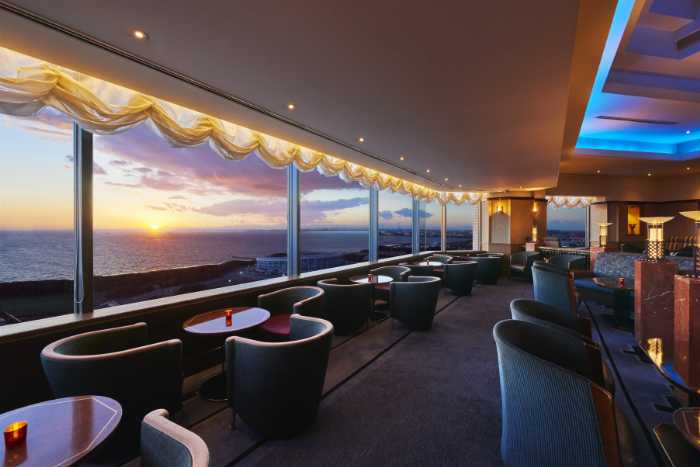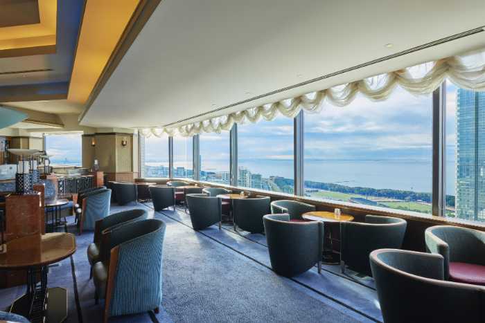 ペントハウスラウンジ「ベイコートカフェ」は、ホテル最上階・地上100mに位置し、晴れた日には富士山も望める絶景が魅力。