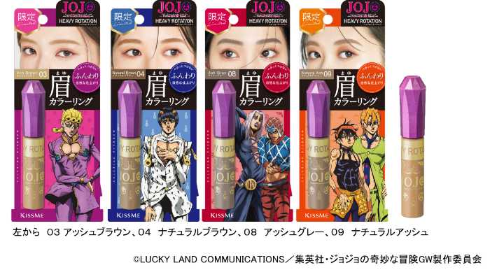 今回のコラボでは、キスミーの人気カラー「03 アッシュブラウン」「04 ナチュラルブラウン」「08 アッシュグレー」「09 ナチュラルアッシュ」の4色に、それぞれ『ジョジョの奇妙な冒険 黄金の風』のキャラクターがデザインされた限定パッケージを採用。