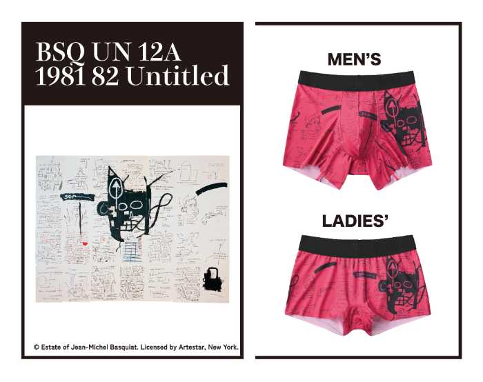 展開されるのは、バスキアの多彩な作品の中でも、特に強いメッセージ性やインパクトを持つ6種類の名画。鮮やかな色彩や抽象的なモチーフが、アンダーウェアに落とし込まれ、感性を刺激する逸品に。