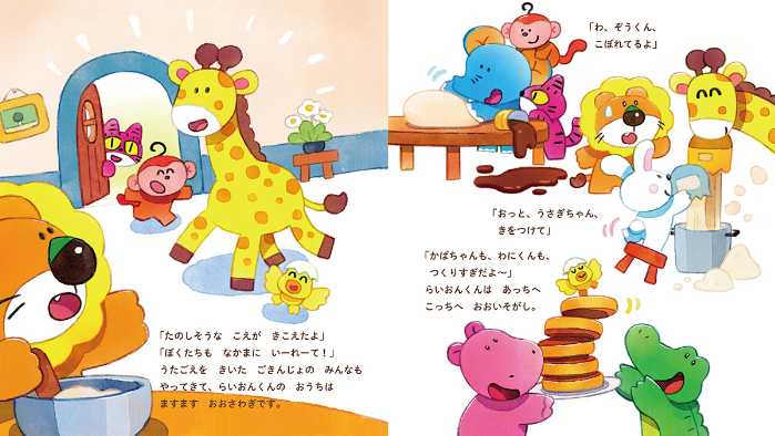 物語の中では、らいおんくんが中心となり“おかし会議”を開く様子が描かれます。みんながそれぞれ作りたいお菓子はバラバラで、ちょっぴり心配な場面も…。