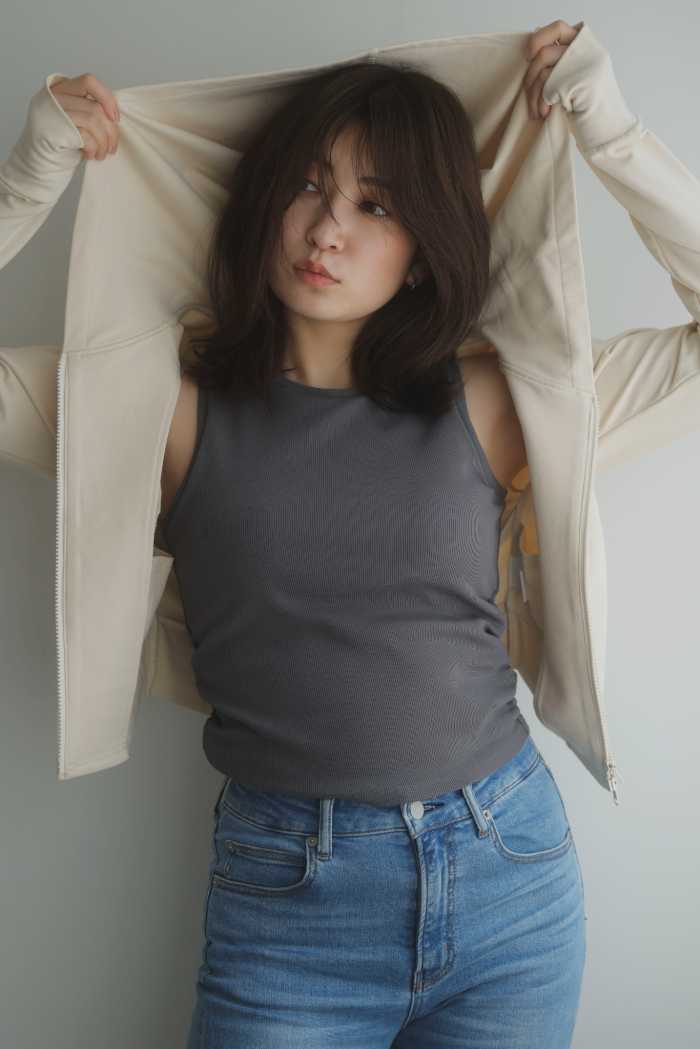 さらに、カップ付きで1枚映えするギャザーノースリトップス(9,900円/4色展開)は、忙しい朝でもおしゃれが即完成!
