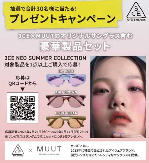 対象商品を購入し、応募フォームにレシートをアップロードすると、抽選で30名様に「3CE × MUUT」限定サングラスセットが当たります。