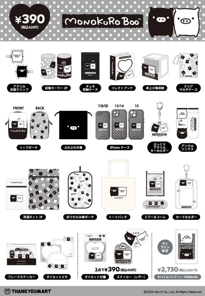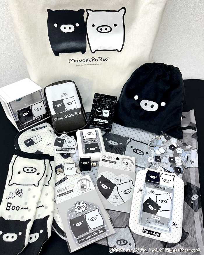 シンプルで落ち着いたモノトーンが魅力の「モノクロブー」は、全24アイテム展開。アンクルソックスやふわふわ巾着、リップポーチなど、毎日使いたくなる実用アイテムが満載です。