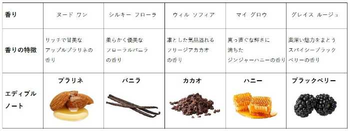それぞれに“エディブルノート”が香る、食べられるものをモチーフにしたグルマン調が特徴です。まるでお菓子を選ぶように、気分に合った香りで一日を彩って♪