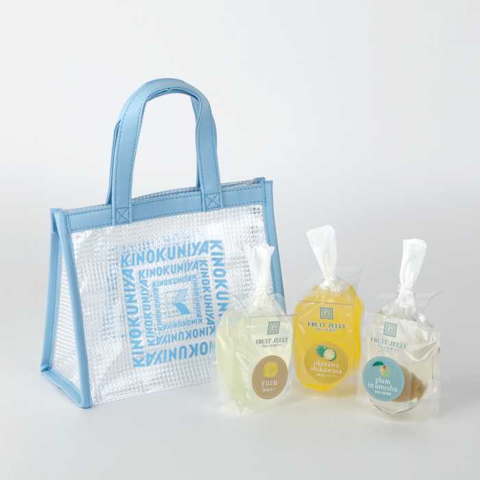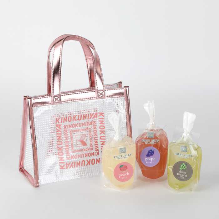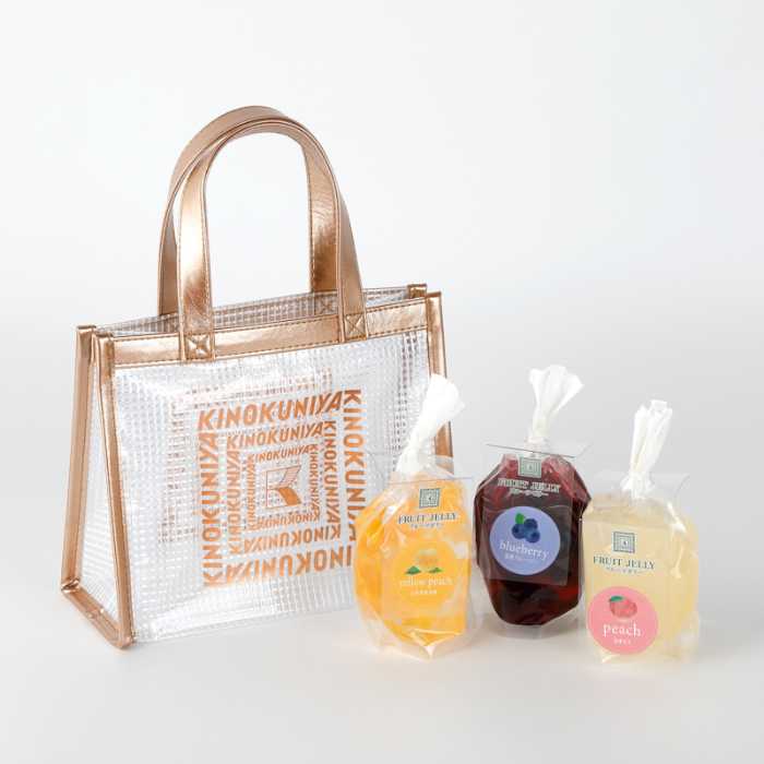 フルーツの美味しさを閉じ込めた「フルーツゼリークリアバッグセット」(各1,296円)は、3色のクリアバッグごとに異なるゼリーをセット。