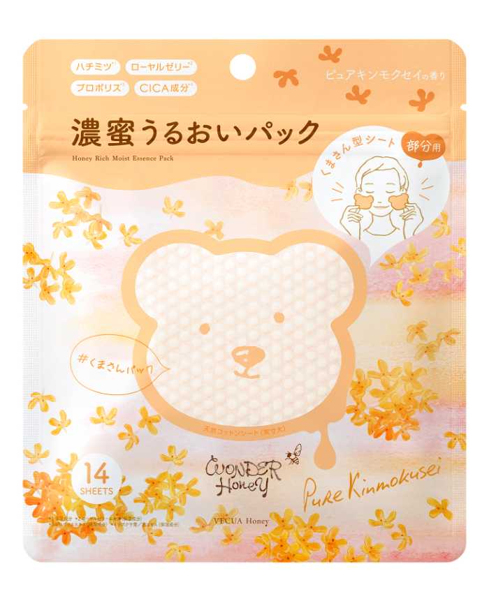 乾燥が気になる部分には「濃蜜うるおいパック ピュアキンモクセイ」(14枚入り/858円)を。くまさん型シートがかわいく、CICAやセラミドなどの美容成分をしっかり届けてくれます。