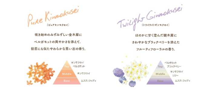 今回登場するのは、甘くやさしい「ピュアキンモクセイ」とロマンティックな「トワイライトギンモクセイ」の香りを楽しめるアイテムたち。