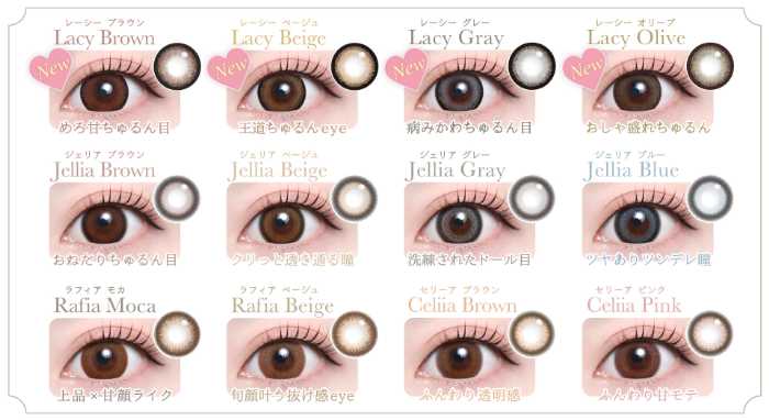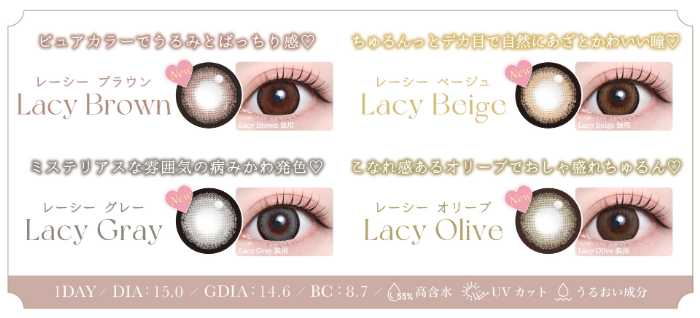 カラーはブラウン・ベージュ・グレー・オリーブの4色展開で、ナチュラル派もハーフ系も満足できるラインナップです。これまで「ワンデーでも欲しい♡」と待ち望んでいた方には朗報です♪
