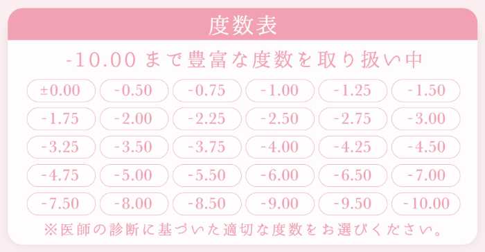 度数は±0.00(度なし)から-10.00までと豊富に揃い、視力に合わせてぴったりのものが選べます。