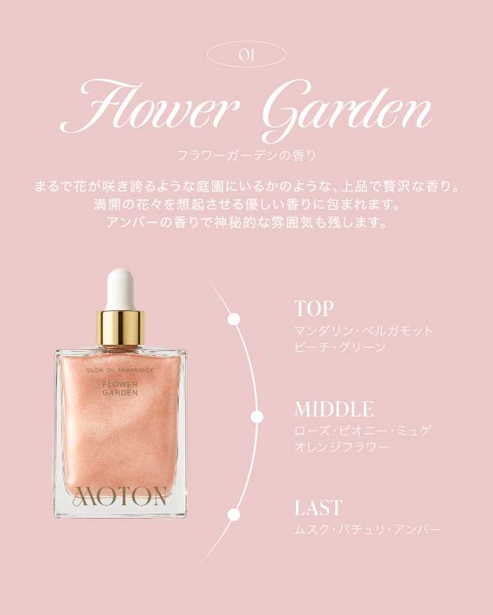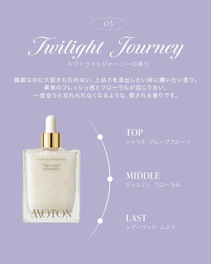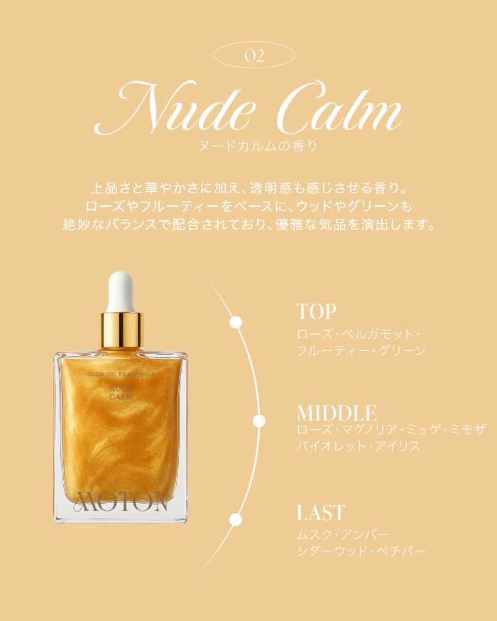 肌に溶け込むような軽やかさと、視線を惹きつけるツヤ感を両立したMOTONの「グロウオイルフレグランス」。人気の香りをまといながら、自分自身の美しさにもっと自信が持てるはずです。