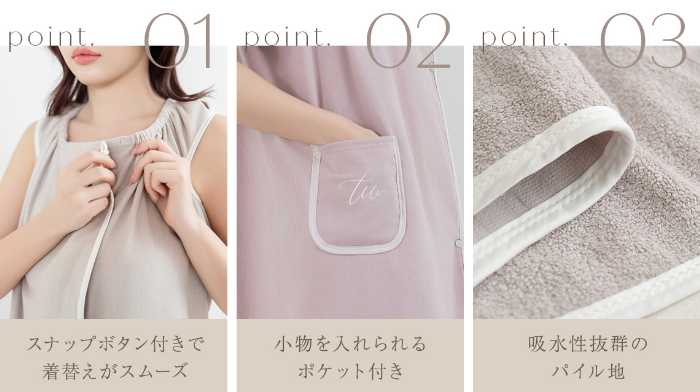 着替え時の視線や濡れた水着の処理、体型カバーなど、女性ならではのリアルなお悩みに寄り添ったアイテムが揃っています。