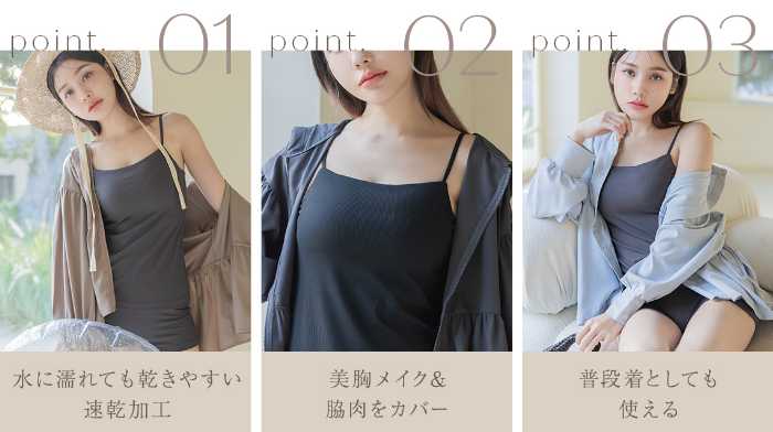 速乾性のある素材で水着としても使えるうえ、美胸メイクが叶うワイヤレスカップ付き。脇肉やお腹をカバーしながら、自然なスタイルアップを実現します。