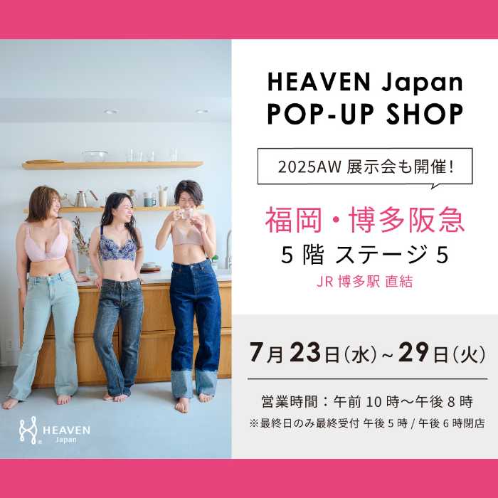 “下着が変わると人生が変わる”——そう感じさせてくれるのが、HEAVEN Japanの適正下着。7月23日(水)〜7月29日(火)の期間限定で、博多阪急百貨店にてポップアップショップが開催中です。プロのアドバイザーによる無料フィッティングや、人気シリーズの試着体験、秋冬新作の展示、さらには防災下着コーナーまで、内容は盛りだくさん♡あなたの“本当に合う”ブラと、ここで出会えるかも。