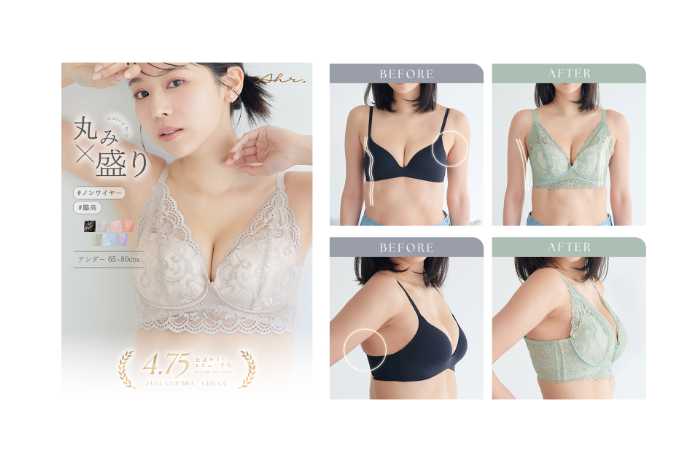 ナチュラルな“丸み×盛り”を叶えつつ、肌なじみの良いレース仕上げで洋服に響きにくく、背中は見えても可愛い華奢なバックデザインに。