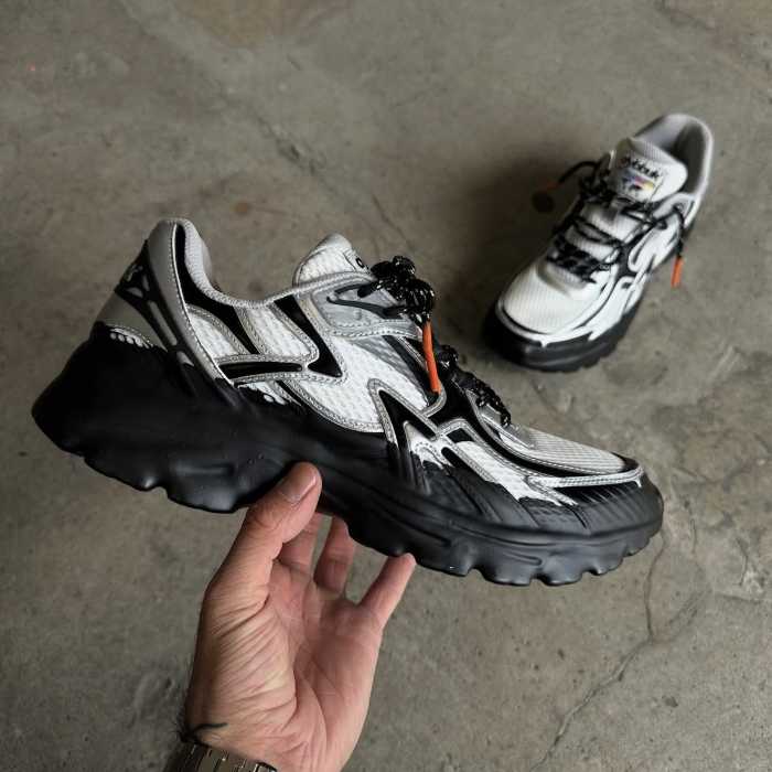 直線と曲線が交差する立体的なアッパーデザインに、分厚いアウトソールの重厚感。