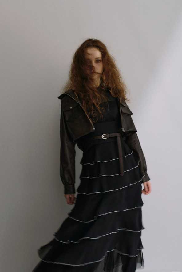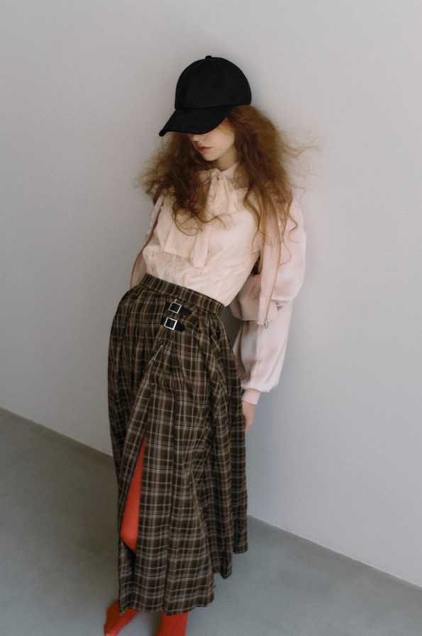軽やかなシフォンやチュールに、レザーやファー、チェック柄を合わせることで、甘すぎない洗練された印象に。