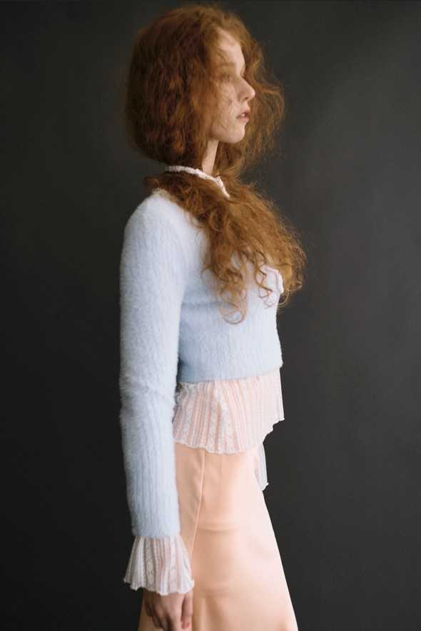 LOOK6のように、レースカットソー×シャギーニットのレイヤードや、LOOK7のマーメイドスカート×ストライプシャツの重ね着テクニックが、秋の装いを一段と表情豊かに。