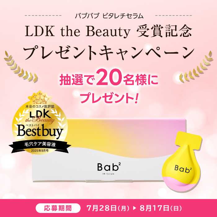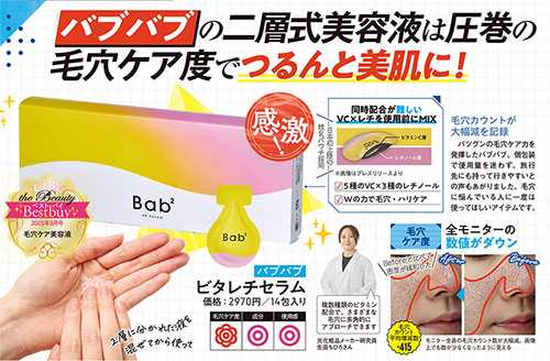 毛穴悩みに本気で向き合いたいあなたに朗報です!敏感肌の方でも安心して使える“生ビタミンC×レチノール”処方の「Bab2(バブバブ)ビタレチセラム」が、LDK the Beauty(2025年9月号)にて毛穴ケア美容液部門のベストバイを受賞。肌へのやさしさと実力を兼ね備えたこのアイテム、次にブームを巻き起こす予感です♪
