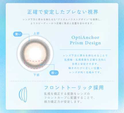乱視用レンズの命とも言える「視界の安定性」。candy magic TORICは、OptiAnchorプリズムデザインによりレンズが瞳の正しい位置にすばやくフィット。