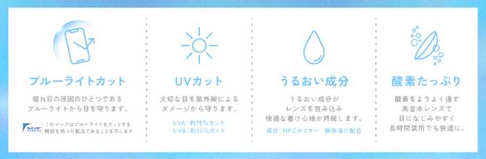 瞬きするたびにズレる…そんなストレスも軽減します。さらに、ブルーライトカットやUVカット、うるおい成分配合と、日常使いに嬉しいスペックがぎゅっと詰まっているのもポイント。