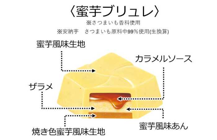 安納芋をさつまいも原料中99%※使用したチロルチョコの「蜜芋ブリュレ」。糖蜜のように濃厚で優しい甘さが特長の蜜芋と、香ばしいカラメルソース、ザラメのシャリっとした食感が絶妙にマッチ。