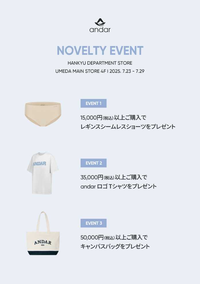 andarのポップアップストアは、2025年7月23日(水)〜29日(火)の期間限定で、阪急うめだ本店4階「コトコトステージ41」にて開催。