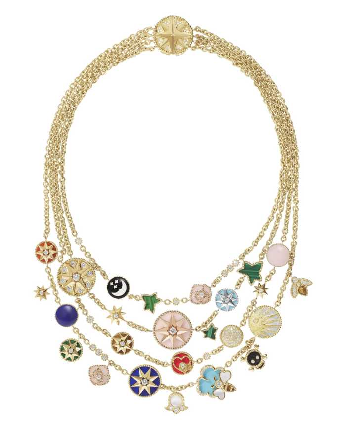 ムッシュ・ディオールが信じたラッキーモチーフ──ミツバチ、バラ、スズラン。それらが色とりどりのストーンとともに配置された「ローズ デ ヴァン チャーム」は、2022年に登場した新章。