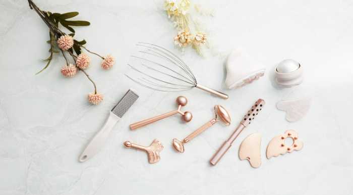 とくに注目は、イチョウ型のフェイストゥールや、華やかなローズクウォーツを使ったケアツール。