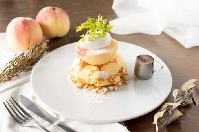 VIVA cafe’sta岡崎でしか味わえない「桃の贅沢クレープ」(税込1,080円)は、まるでケーキのような新感覚スイーツ。