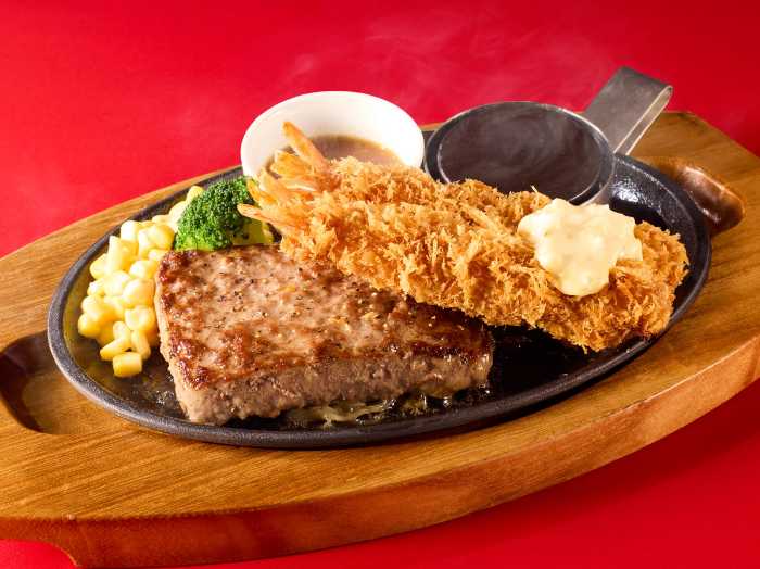 そして、2本の海老フライにたっぷりタルタルソースが添えられた「ビーフハンバーグステーキ 海老フライ」(税込1,419円)は、海老好きさんにおすすめ♪