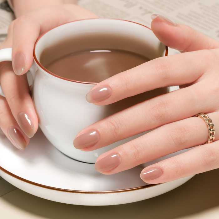指先に溶け込むようなクールトーンのヌーディーベージュ。知的で洗練された印象に。